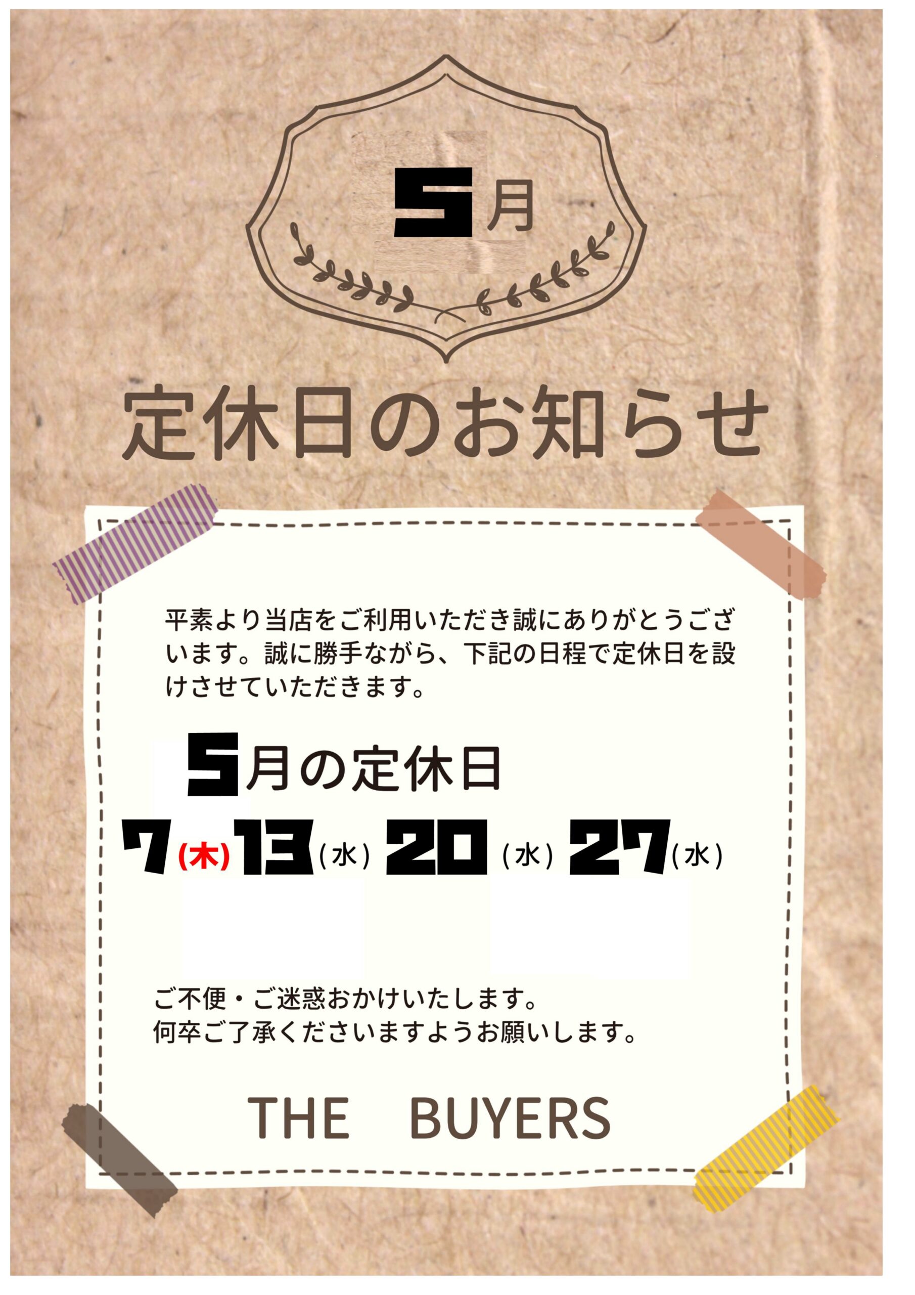 【重要】5月の定休日のお知らせ...