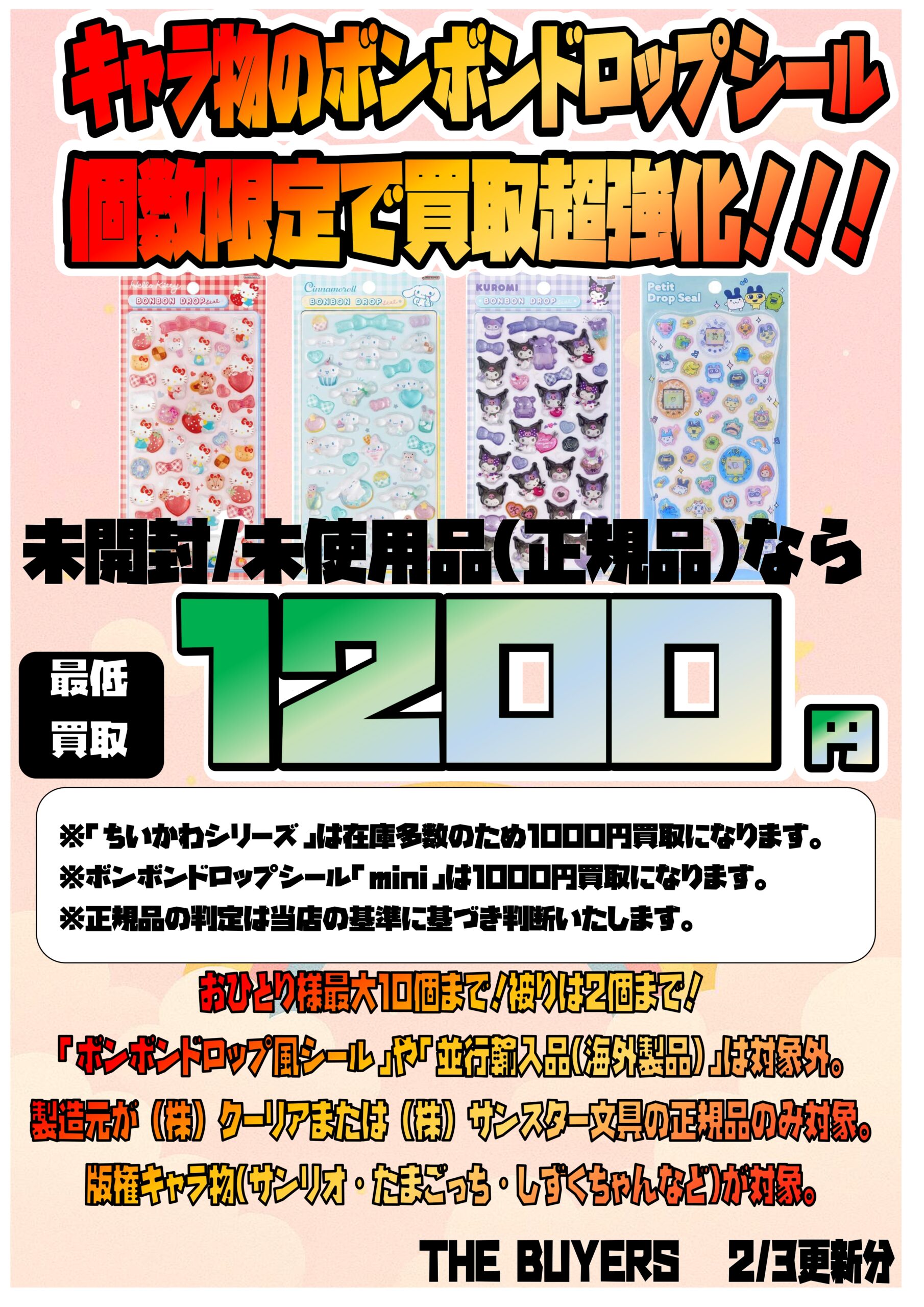 ボンボンドロップシール買取チラシ更新しました!在庫豊富な「ちいかわ」以外は1200円買取にUPしました!