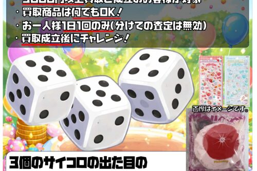 3/20~3/22の3連休で開催!買取成立ダイスチャレンジ!話題のメロジョイスクイーズやボンボンドロップシールが当たる!?ぜひご参加下さい!