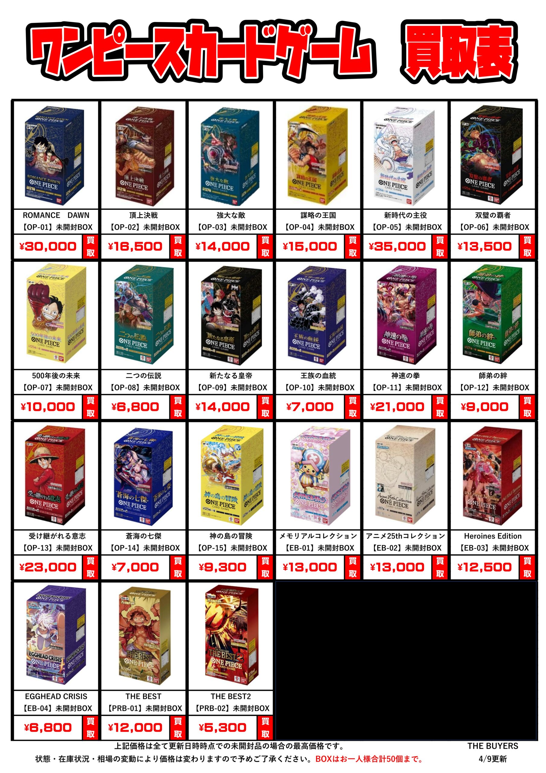 ワンピースカード未開封BOX買取チラシ更新しました!