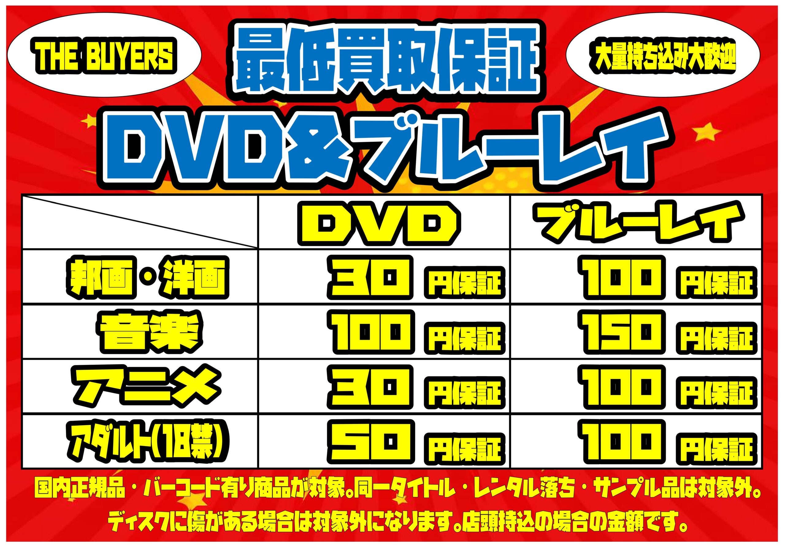 【邦画/洋画/音楽/アニメ/アダルト(18禁)】のDVD&ブルーレイの最低買取保証始めました!アダルト持込の場合は中身が見えないようにお持ち込みお願い致します!