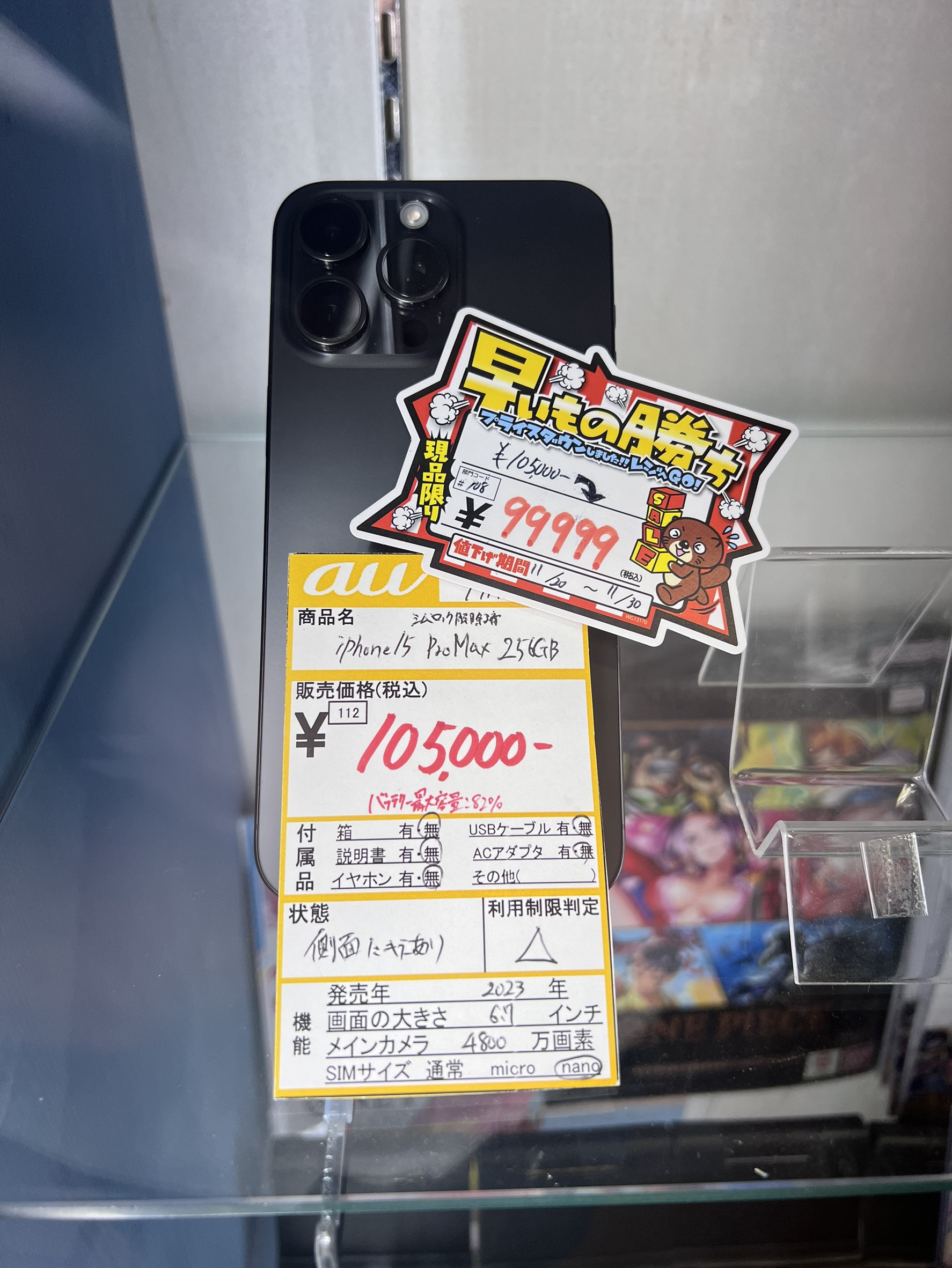 iPhone15ProMax256GBが99999円で特価販売開始!早いもの勝ちです(*^^*)