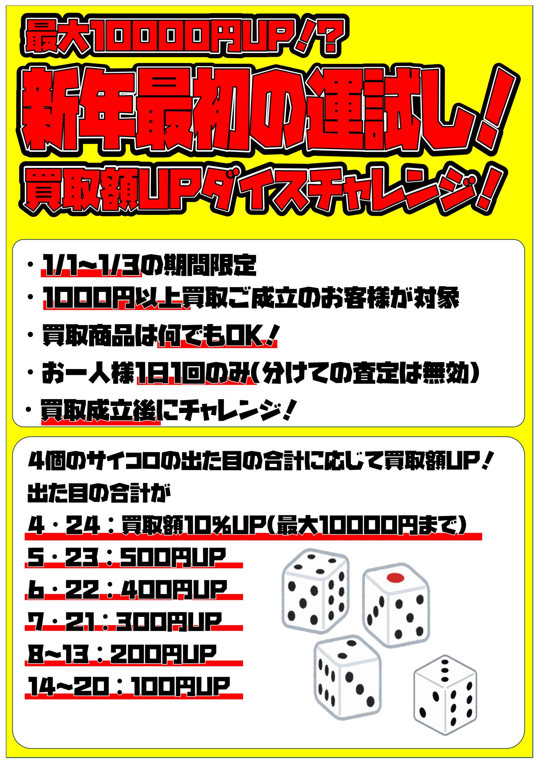【正月イベント】最大10000円UP!?1/1~1/3の期間限定で買取額UPダイスチャレンジ開催!