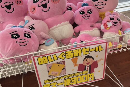 ぬいぐるみワゴンセール開始!セールワゴン内のぬいぐるみ300円均一で販売中!